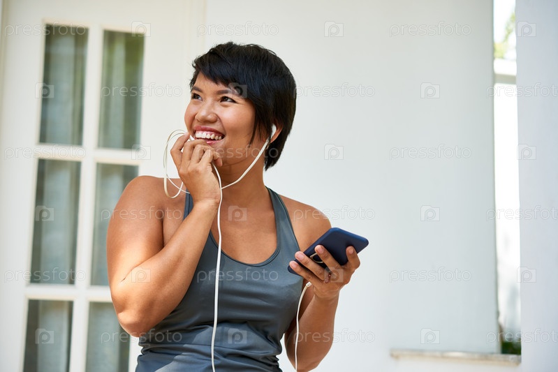 Смеющаяся спортивная женщина со смартфоном