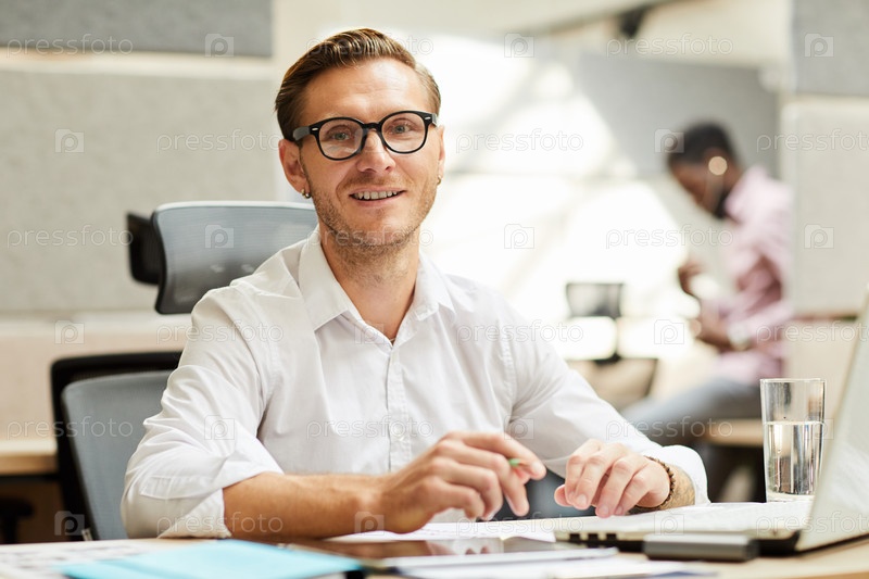Улыбающийся красивый молодой менеджер-мужчина со стеблями, носящий очки и белую рубашку сидит на рабочем месте