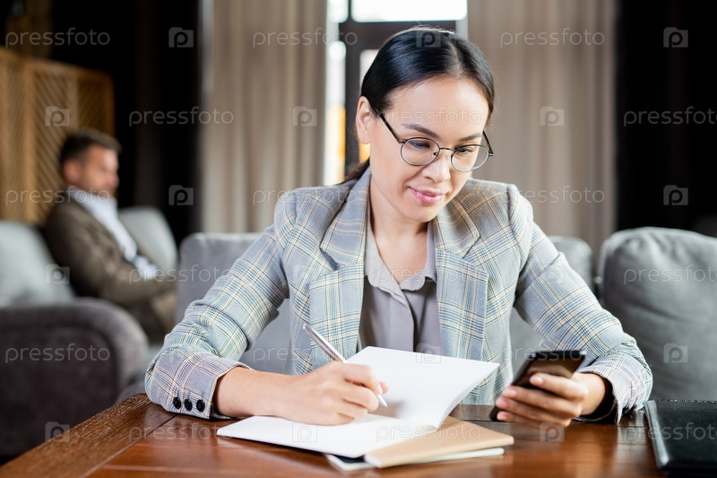 Молодая элегантная деловая женщина прокручивает смартфон, делая рабочие заметки