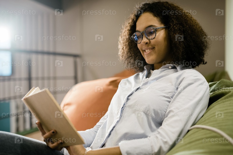 Счастливая молодая умная студентка в новых очках, читающая книгу на диване