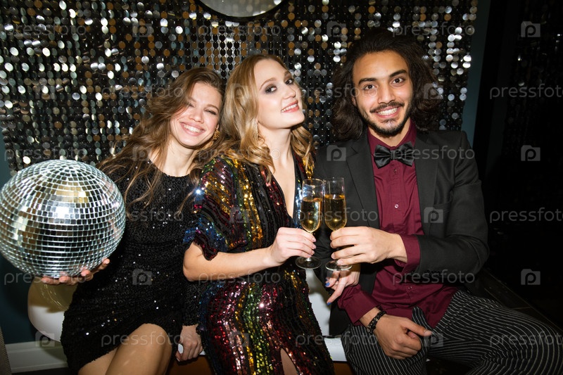 Группа молодых веселых друзей в праздничных нарядах, делающих тосты на вечеринке
