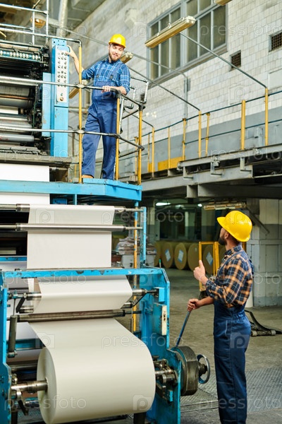 Содержание промышленных сотрудников в жестких шляпах, работающих на печатном станке и разговаривающих во время производственного процесса