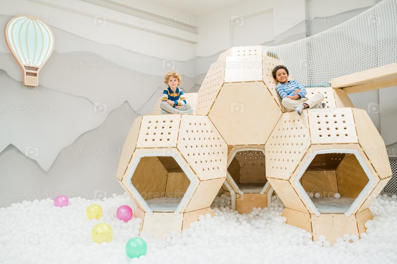Два межкультурных отдыхающих милых ребенка в повседневной одежде проводят время на детской площадке