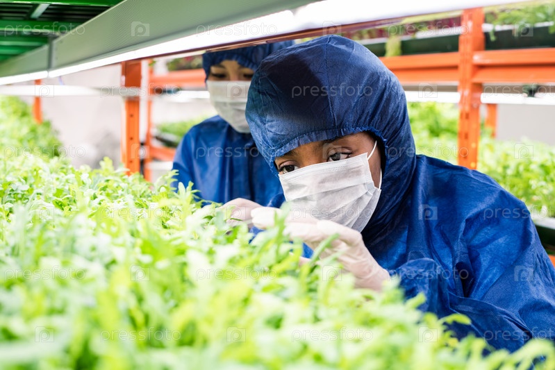 Молодые женщины-исследователи в области защитной рабочей одежды, заботящиеся о зеленых саженцах