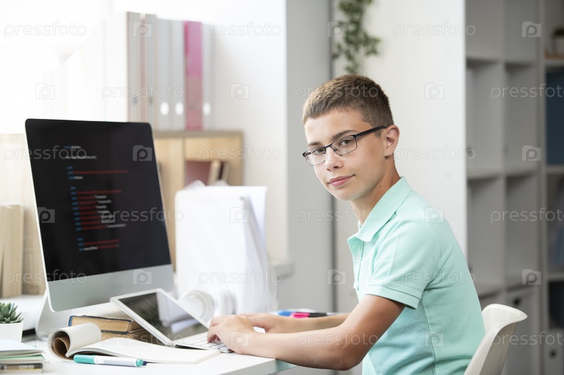 Серьезный ученик средней школы сидит за столом перед монитором компьютера