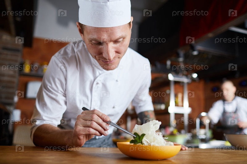 Шеф, декорирующий гурманское блюдо