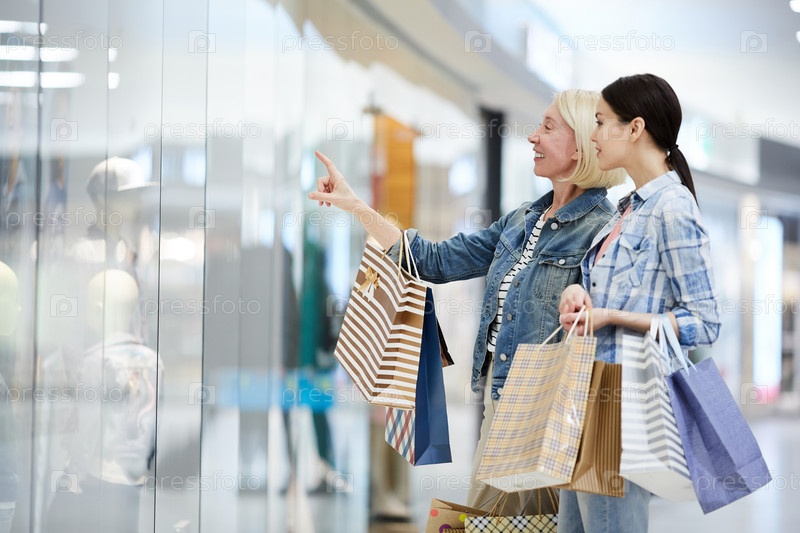 Веселая мать и дочь обсуждают одежду манекенов