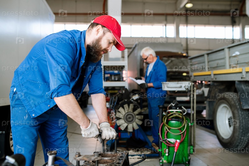 Бородатый мужчина в рабочей одежде исправляет одну из деталей двигателя во время ремонта мотора