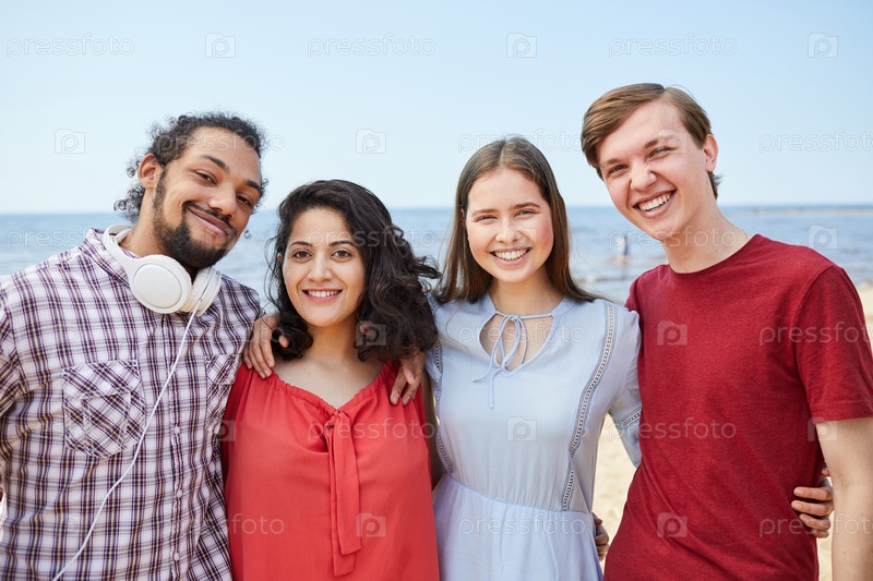 Четыре друга, позирующие у моря
