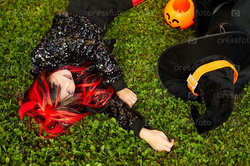 Маленькая девочка, лежащая на траве в Хэллоуин
