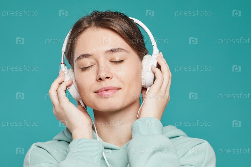 Спокойная привлекательная молодая женщина с закрытыми глазами, носящая проводные наушники и слушающая расслабляющую музыку на зеленом фоне
