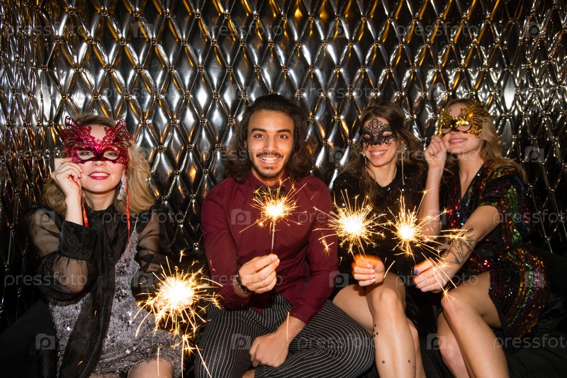 Три счастливых девушки в венецианских масках и парень, держащий сверкающие бенгальские огни