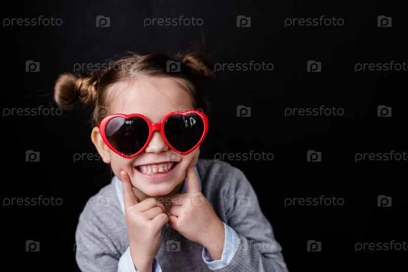 Милая веселая девушка с зубчатой улыбкой, смотрящая через стильные солнцезащитные очки