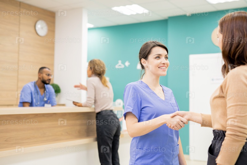 Красивая молодая улыбающаяся врач в униформе, дрожащая рукой женщины-пациента