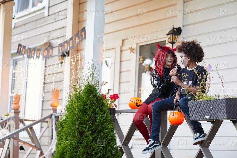 Дети едят конфеты на Хэллоуин