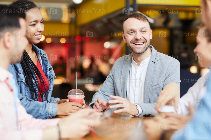 Веселые молодые мультиэтнические друзья сидят в кругу за столом и делятся историями, проводя свободное время в кафе