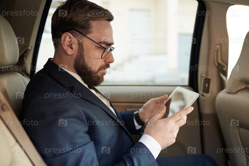 Бизнесмен, использующий планшетный компьютер в машине