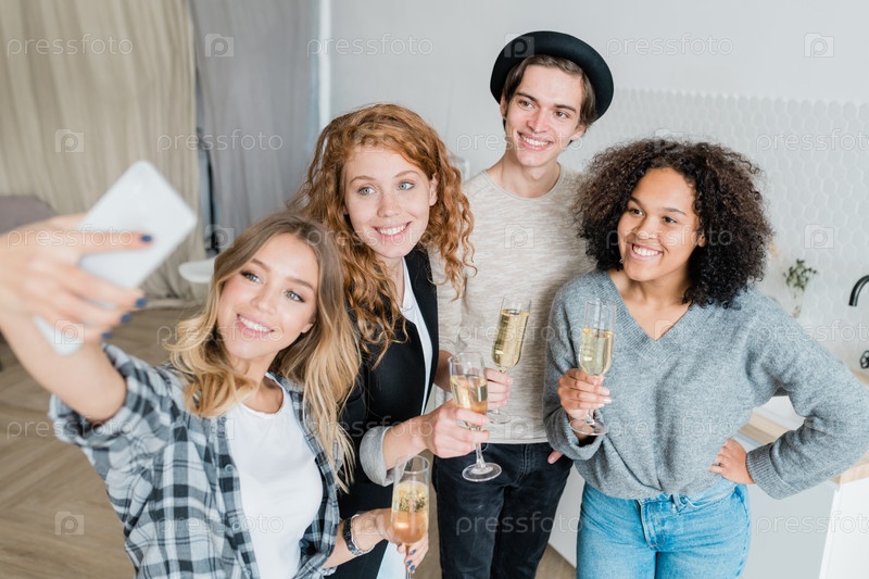 Группа счастливых молодых мультикультурных друзей с шампанским, делающих селфи на вечеринке