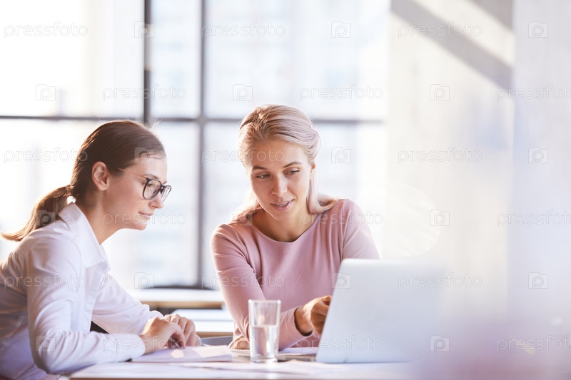 Содержимое продуманных молодых дам, сидящих за столом в кафе и использующих ноутбук во время обсуждения веб-проекта
