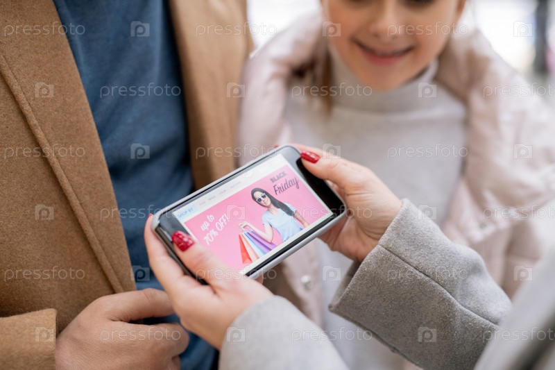 Женские руки, держащие смартфон с домашней страницей интернет-магазина