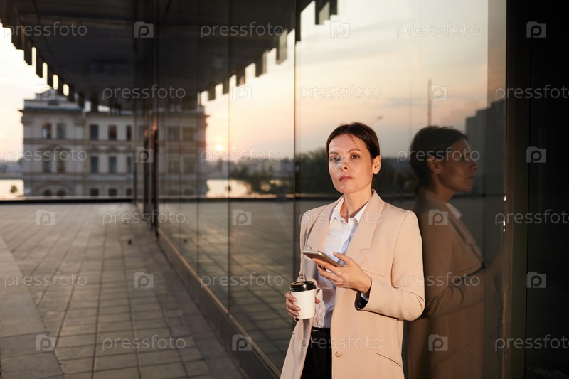 Портрет спокойной деловой женщины средних лет в модном куртке, стоящей в финансовом районе и пьющей кофе