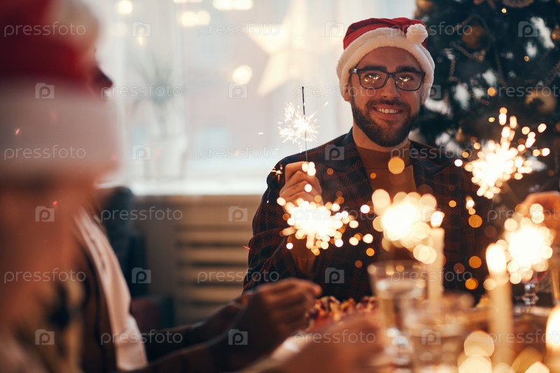 Бородатый человек наслаждается празднованием Рождества