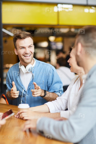 Взволнованный красивый парень со стеблями, носящий наушники на шее, сидящий за столом и делающий пистолеты с пальцами во время обмена новостями с друзьями в кафе