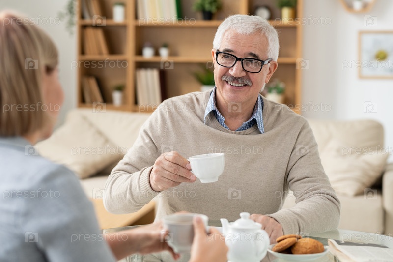 Счастливый пенсионер с чашкой чая смотрит на свою дочь во время разговора