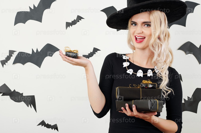 Счастливая ведьма с дарами и подарками на Хэллоуин