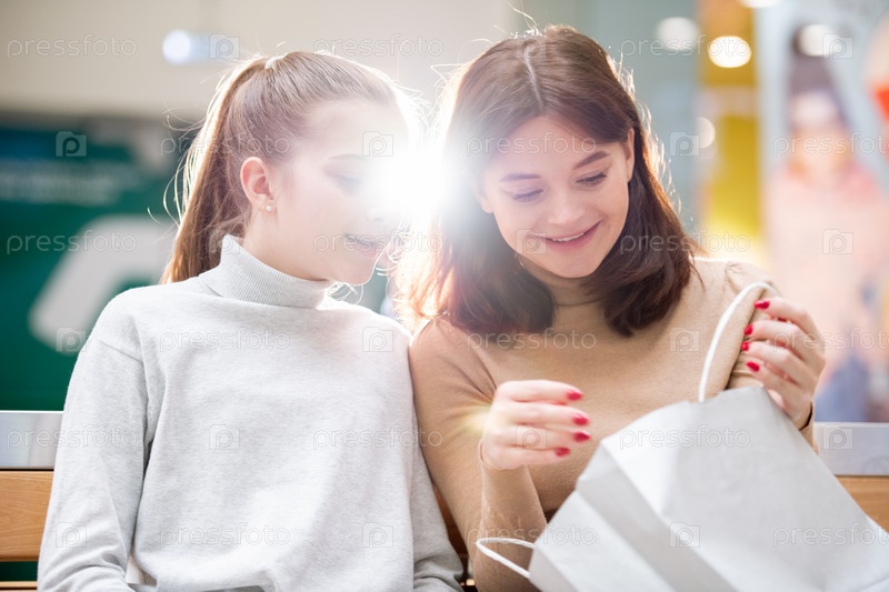 Молодая женщина держит открытый бумажный пакет, показывая симпатичной девушке подарок