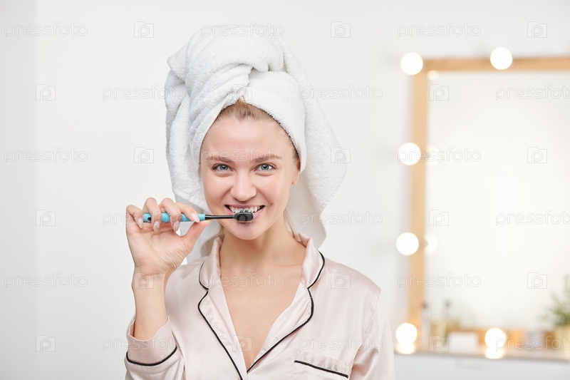 Здоровая молодая женщина с зубной щеткой чистит зубы в ванной