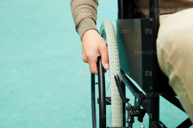 Близкий план неузнаваемого человека-инвалида, толкающего ручное колесо инвалидной коляски во время передвижения на открытом воздухе