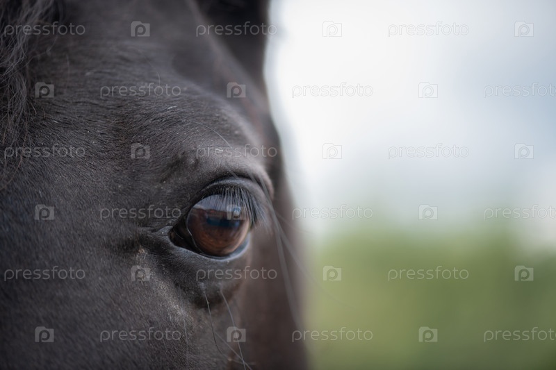 Левый карий глаз с ресницами и короткими волосами вокруг черной кобыли
