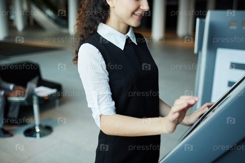 Сельскохозяйственная предпринимательница использует билетный автомат в аэропорту