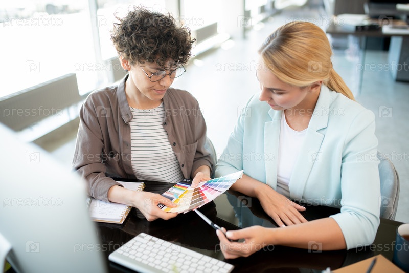 Молодые женщины-дизайнеры консультируют во время работы над новой коллекцией интерьеров