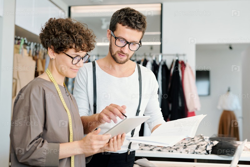 Красивая молодая портная и ее коллега обсуждают новые идеи