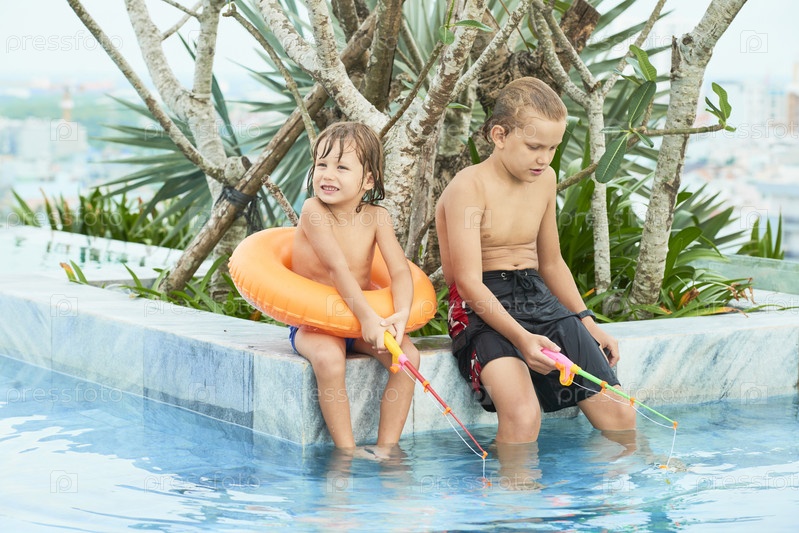 Два мальчика ловят рыбу у бассейна
