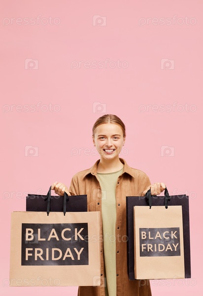 Портрет позитивной красивой молодой женщины в длинной рубашке, хвастающейся покупками в черную пятницу