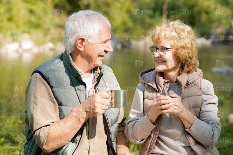 Счастливые зрелые активные туристы с горячим чаем, наслаждающиеся отдыхом в солнечный день