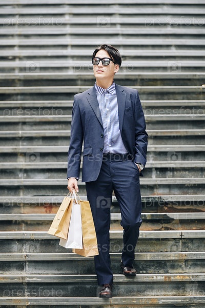 Модный мужчина покупает в городе