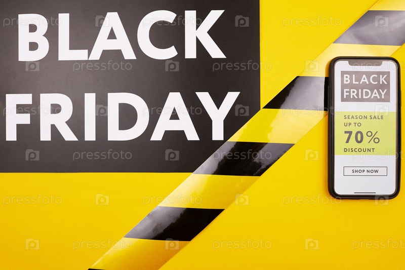 Выше вид на плакат черной пятницы и смартфон с веб-страницей, посвященной продаже в магазине, концепция предложения Black Friday