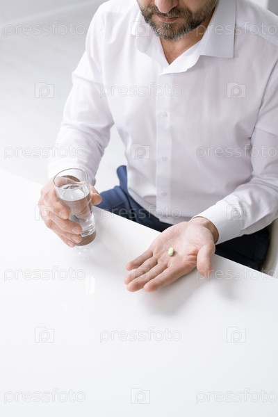 Руки бородатого бизнесмена с головной болью, держащего таблетку и стакан воды