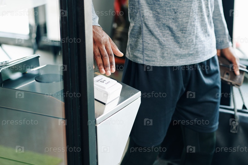 Посетитель тренажерного зала нажимает кнопку выхода