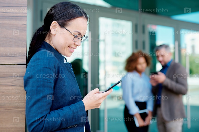 Счастливая молодая брюнетка-женщина прокручивает или читает сообщение в смартфоне на улице