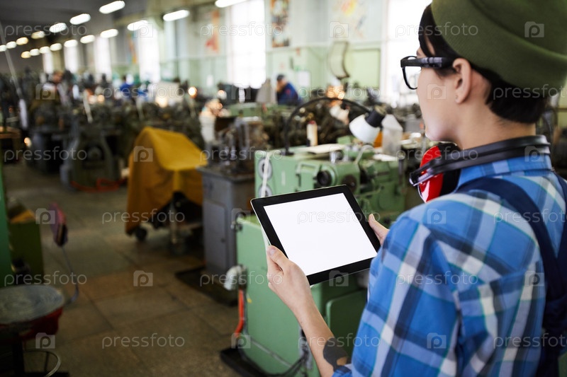Задний вид мыслящей женщины-инженера с защитниками для ушей на шее, использующей цифровой планшет во время осмотра производственного цеха на фабрике