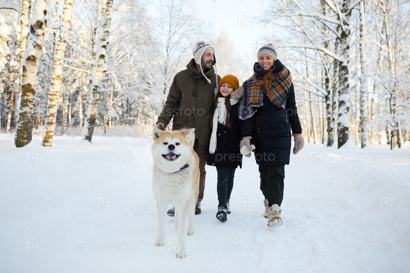 Семейная прогулка собаки зимой