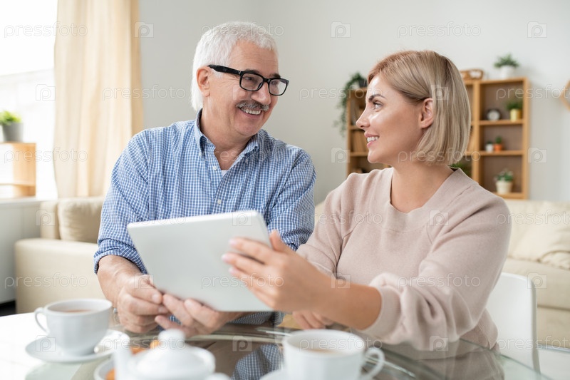 Счастливая молодая женщина и ее старший отец обсуждают любопытное видео в сенсорной панели