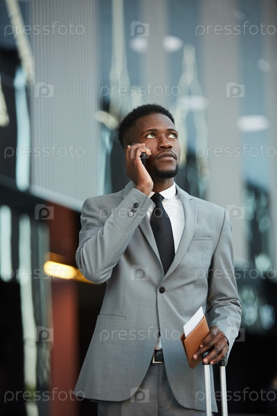 Чернокожий бизнесмен думает и разговаривает по телефону в аэропорту