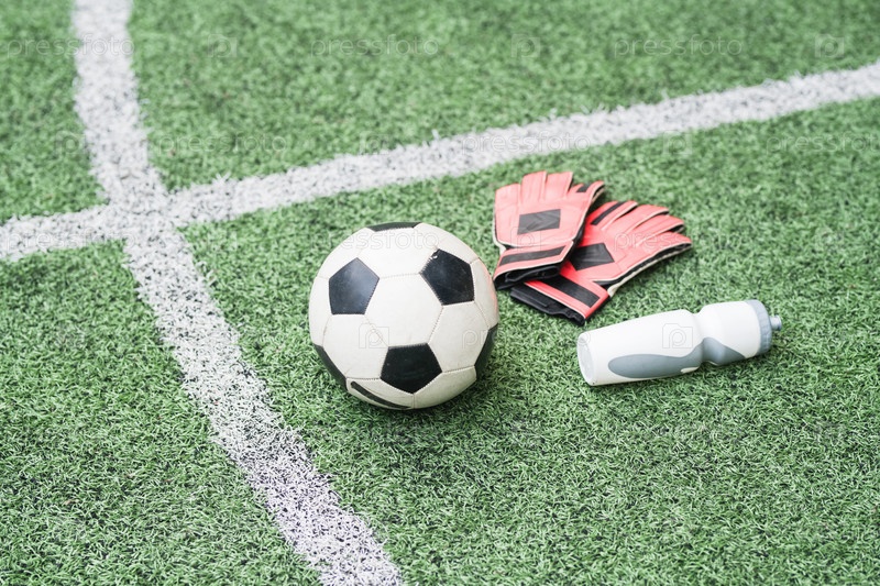Группа спортивного снаряжения - футбольный мяч, кожаные перчатки и пластиковая бутылка с водой