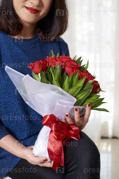 Женщина получает цветы на годовщину